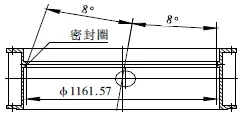 閥體起密封作為的為密封圈,焊接在閥體內(nèi)(圖5)。在2.5m立車上將組焊好的閥體裝夾在閥體密封圈加工工裝上,將立車刀桿旋轉(zhuǎn)8°,根據(jù)圖紙設(shè)計要求,找正后沿圓錐母線方向走刀,車至未焊不銹鋼前的尺寸。然后堆焊不銹鋼,最后將焊好不銹鋼的閥體重新上立車,按上述方法車閥體密封圈至圖紙要求尺寸。最后在立車刀架上裝磨頭,對閥體密封圈進(jìn)行磨削處理,使其達(dá)到圖紙設(shè)計粗糙度要求。