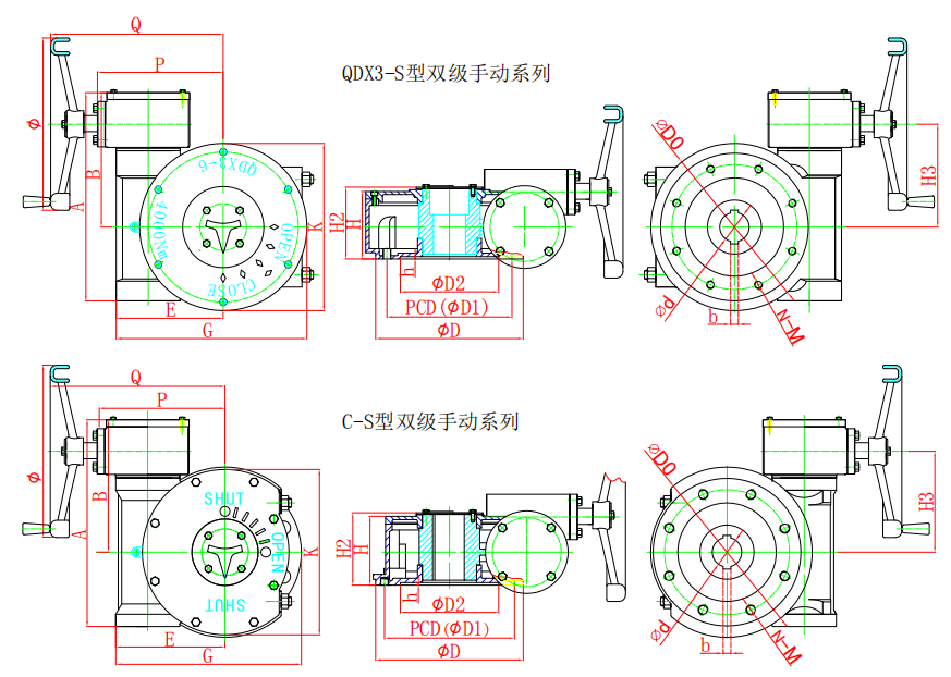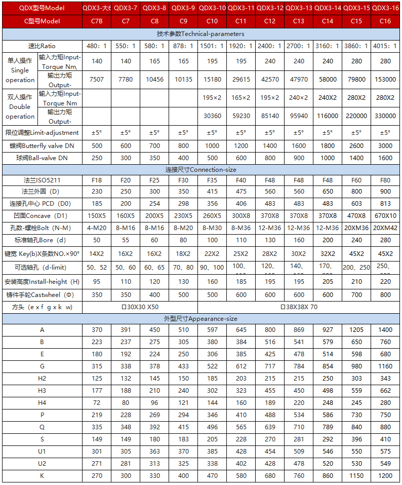 該系列是小蝸輪箱與大蝸輪箱對接組合成為二級傳動(dòng)蝸輪減速增壓機(jī)構(gòu),提高了機(jī)械總效率,輸入小力矩,開動(dòng)大閥門,使操作人員省力,每種型號提供多個(gè)傳動(dòng)比,特殊型可輸出360°無限多回轉(zhuǎn),能更好的匹配不同規(guī)格的閥門。
